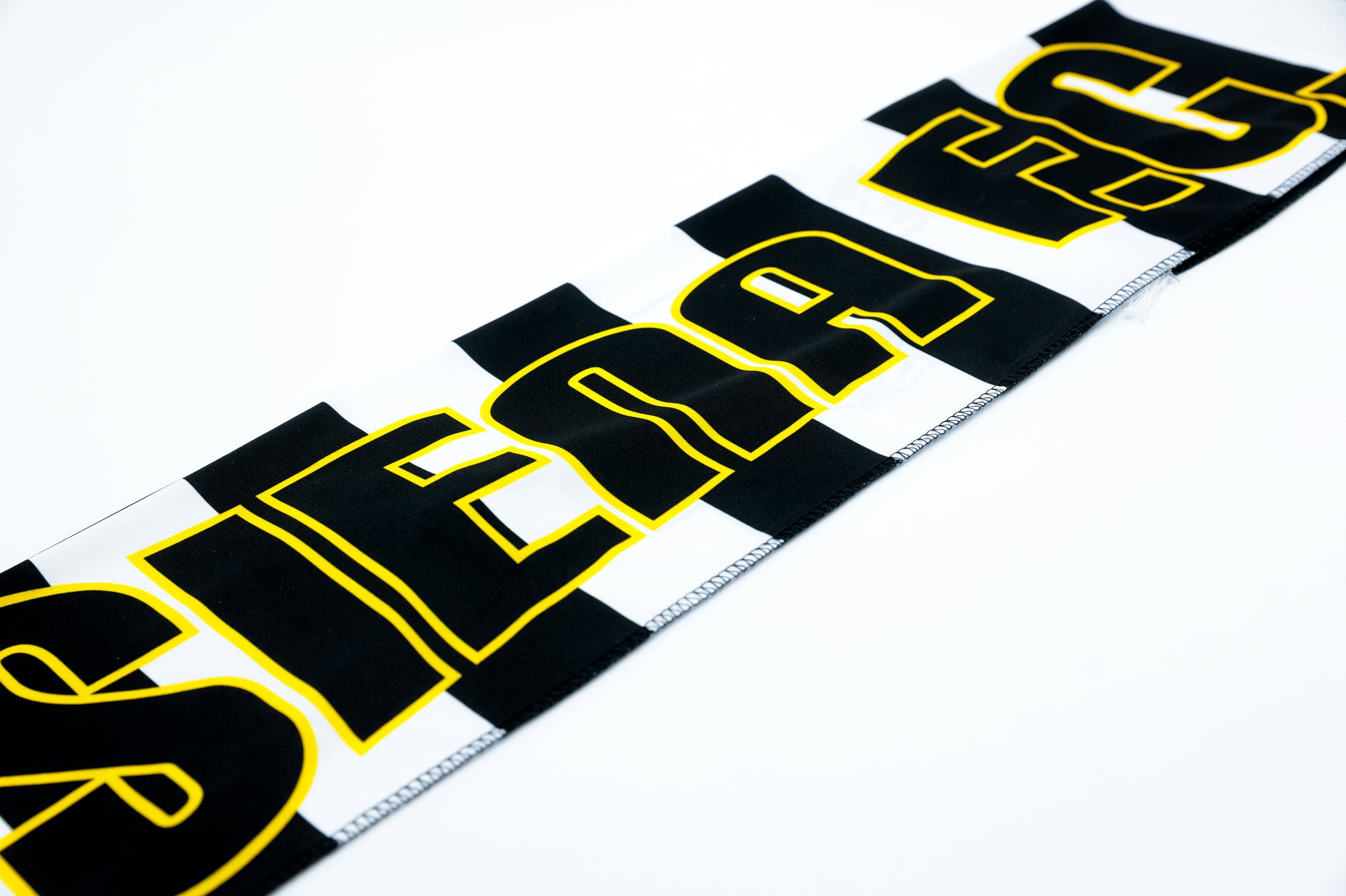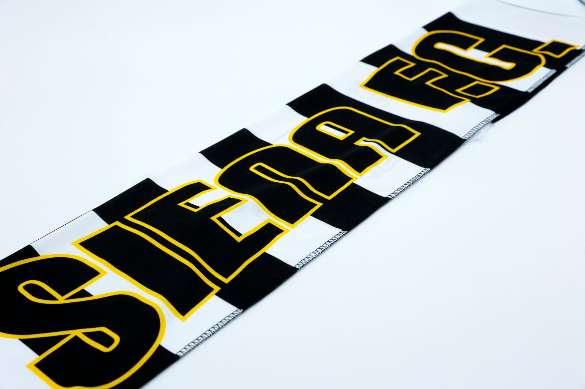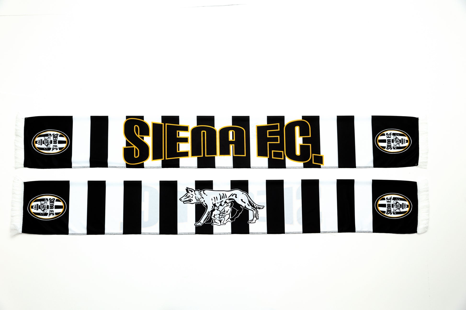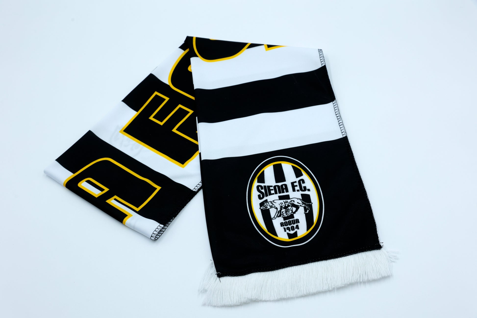 La sciarpa in raso del Siena F.C. è l’accessorio perfetto per ogni tifoso. Realizzata con materiale di alta qualità, presenta le iconiche righe bianconere e dettagli in oro che richiamano lo stemma ufficiale del club. Da un lato, il logo del Siena F.C. accompagna la scritta “Siena F.C.” in caratteri dorati; dall’altro, la Lupa Senese rende omaggio alla tradizione e alla storia del club. Morbida al tatto e con frange bianche.